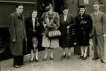 Description :DEBOUT SUR LE QUAI DE LA GARE: TRAIN A L'ARRIERE-PLAN. DANS L'ORDRE DE GAUCHE A DROITE: SYLVIO LACHARITE, KATHLEEN SHEA, BIDU SUZIE, Mme F.H. BRADLEY, CHARLOTTE NADEAU ET PAUL-EMILE FORTIER.