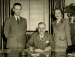 Description :PAUL-EMILE FORTIER DEBOUT A GAUCHE PORTE LE COMPLET-CRAVATE. ASSIS AU CENTRE LE MAIRE SOURIANT S'APPRETE A SIGNER UN DOCUMENT. DEBOUT A DROITE MIMI SHEA PORTE UN TAILLEUR ET UN CHAPEAU.