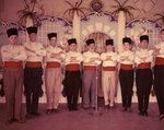 Description :NEUF MEMBRES DU CLUB DEGUISES EN RUSSES S'APPRETENT A EXECUTER UNE DANSE RUSSE. ILS ONT LES BRAS CROISES, L'AIR SERIEUX.