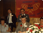 Description :1.1 ROSAIRE CASTONGUAY, PRESIDENT, ASSIS A UNE TABLE. DERRIERE LUI AU CENTRE ROGER GINGUES TENANT UN MICRO DANS SA MAIN. A COTE DE LUI A GAUCHE UN AUTRE HOMME. IL Y A AUSSI DEUX FEMMES DE CHAQUE COTE DU PRESIDENT. A L'EXTREME DROITE UN BOUQUET...