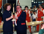 Description :3.1 PREMIER PLAN, JULIEN AUBE, PRESIDENT, DONNANT UN TROPHEE A UNE FEMME A GAUCHE. 2e PLAN UNE FEMME ET UN HOMME TOUT HABILLE DE ROUGE A PANTALON, CRAVATE, VESTE SUR LAQUELLE EST EPINGLE PLUSIEURS MEDAILLES ET CHEMISE BLANCHE. 3.2 REMISE DE TR...