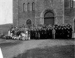 Description :M.L'ABBE VICTOR DUPUIS ENTOURE DES MEMBRES DE SA FAMILLE, AMIS ET REPRESENTANTS DU CLERGE LORS DE LA CELEBRATION DE SA 1ere MESSE, A L'ENTREE DE L'EGLISE ST-HERMENEGILDE
