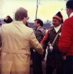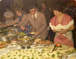 Description :DEVANT UNE TABLE DE BUFFET, AU CENTRE, ROSAIRE JACK CASTONGUAY PRESIDENT, SE SERVANT UNE ASSIETTE DE NOURRITURE. IL EST ENTOURE DE PLUSIEURS PERSONNES.