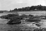 Description :LA RIVIERE ST-FRANCOIS A DRUMMONDVILLE. EN AVANT-PLAN, VUE SUR PLUSIEURS ROCHES REGROUPEES DANS LE LIT DE LA RIVIERE, AINSI QU'UNE PETIT CHUTE. EN ARRIERE-PLAN, UN AUTRE GROUPEMENT DE ROCHES ET UNE FORET DANS LAQUELLE ON VOIT 3 CHALETS OU MAIS...
