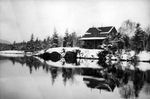 Description :AU PREMIER PLAN, LE LAC FRASER EN ARRIERE, LE CHALET DU CLUB DE CHASSE ET DE PECHE.