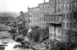Sujet principal :GORGE DE LA RIVIERE MAGOG AVEC VUE ARRIERE DES COMMERCES DE LA RUE FRONTENAC