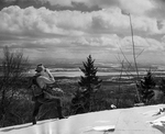 Description :EN PREMIER PLAN, VUE SUR LE HAUT DU MONT ORFORD ENNEIGE, UN HOMME DE DOS, REGARDANT AVEC DES JUMELLES, LE LAC MEMPHREMAGOG.