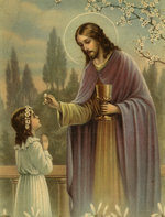 Description :LE CHRIST AVEC UNE AUREOLE AUTOUR DE LA TETE EST EN TRAIN DE DONNER LA COMMUNION A UNE FILLETTE.