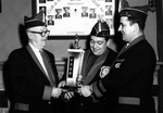 Description :A GAUCHE LE PRESIDENT DU CLUB TUQUE-ROUGE M. LUCIEN TRAHAN, AU CENTRE M. JULIEN AUBE PRESIDENT DU CORPS DE CLAIRONS ET A DROITE M. MAURICE LAFRANCE DIRECTEUR. CHACUN TIENT LE TROPHEE. EN ARRIERE-PLAN SUR LE MUR IL Y A UNE MOSAIQUE DES ANCIENS ...