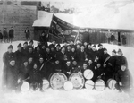 Sujet principal :LE CORPS DE TAMBOURS ET CLAIRONS DU CLUB TUQUE-ROUGE DEVANT LE CHALET DE CHARLIE CABANA