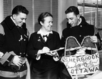 Description :LA MAIRESSE D'OTTAWA, CHARLOTTE WHITTON, TENANT DANS SES MAINS UN CAHIER OUVERT ET UN CRAYON. UN RAQUETTEUR A DROITE TIENT DANS SES MAINS UNE PAIRE DE RAQUETTES ATTACHES ENSEMBLE OU IL EST ECRIT "SHERBROOKE TO OTTAWA" A GAUCHE DE LA PHOTO.
