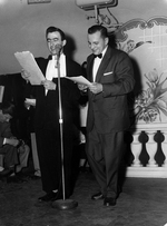 Description :DEUX PERSONNES SE TIENNENT DEBOUT DEVANT UN MICROPHONE TENANT DES FEUILLES DANS LEURS MAINS. A GAUCHE GERRY POULIN ET A DROITE PAUL CHEVIGNY, TOUT LES DEUX EN HABIT, CHEMISE BLANCHE ET NOEUD PAPILLON. A L'EXTREME GAUCHE, UNE PERSONNE ASSISE, L...