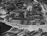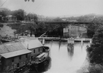 Description :ON VOIT LE BARRAGE HYDROELECTRIQUE, LA CENTRALE ELECTRIQUE FRONTENAC, LE PONT WOLFE ET EN ARRIERE-PLAN LA MAGOG WOOLEN MILLS FACTORY.