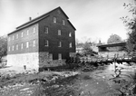 Description :VUE EXTERIEURE DU MOULIN BLANCHETTE CENTRE D'INTERPRETATION DE LA LAINE. A DROITE, LA PASSERELLE CONDUISANT AU MOULIN ET A L'ARRIERE-PLAN, LE PONT.