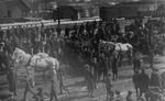 Description :PRES DE 200 HOMMES SONT RASSEMBLES PRES D'ENTREPOTS DONT L'UN PORTE LE NUMERO 5. UN WAGON DU BOSTON AND MAINE EST GARE SUR UNE VOIE. DES GENS EN MANTEAUX SOMBRES PORTANT CHAPEAUX MELON SONT DANS DES CALECHES TANDIS QUE DES CURIEUX LES ENTOUREN...