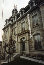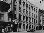 Description :DES BANDEROLES SONT ACCROCHEES A LA FACADE DE L'HOTEL DE VILLE SITUE RUE WELLINGTON NORD. LE THEATRE HIS MAJESTY, SON VOISIN DE DROITE, AFFICHE AUSSI DES BANDEROLES.