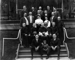 Description :PHOTO DE GROUPE PRISE DANS LES ESCALIERS DE LA RESIDENCE DU DR. LEONILDE-CHARLES BACHAND EN COMPAGNIE D'ANCIENS CONFRERES DE CLASSE ET DES MEMBRES DE SA FAMILLE