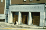 Description :EN AVANT-PLAN, LA RUE FRONTENAC. A GAUCHE UN PANNEAU INDIQUANT LE CENTRE D'EXPOSITION LEON MARCOTTE. GRAVE SUR LE CIMENT: AUDITORIUM SAINT-CHARLES. COLONNES. PORTES EN BOIS SCULPTEES.