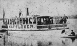 Description :VUE SUR LE BATEAU A VAPEUR MAYFLOWER. A L'INTERIEUR COMME A L'EXTERIEUR, PLUSIEURS HOMMES ET FEMMES NAVIGENT SUR LE LAC MASSAWIPPI.