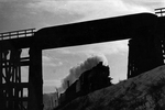 Description :VUE SUR LE TRAIN DU QUEBEC CENTRAL RAILWAY, EN MARCHE CRACHANT UN NUAGE DE FUMEE GRISATRE. IL PASSE SOUS LE PONT DU QUEBEC CENTRAL RAILWAY.