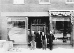 Description :VUE DU JOURNAL SHERBROOKE GAZETTE EN HIVER, 4 JEUNES HOMMES DEBOUT DANS L'ENTREE. AFFICHE DANS LA VITRINE DE DROITE: GAZETTE OFFICE. AU SOMMET DE LA FENETRE UN AUVENT. FENETRE DE GAUCHE: JOB PRINTING.
