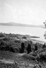 Sujet principal :AU PIED DU LAC MONTJOIE, QUATRE PRETRES DESCENDENT LA COLLINE