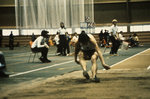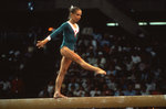 Description :6.1 JEUNE FILLE VETUE D'UN MAILLOT VERT S'EXECUTE A LA POUTRE. A L'ARRIERE-PLAN, ON DISTINGUE UNE FOULE NOMBREUSE. 6.2 AUTRE JEUNE FILLE PORTANT UN MAILLOT BLEU SURLA POUTRE.