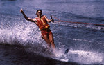 Description :JEUNE FILLE PORTANT UN GILET DE SAUVETAGE ET FLOTTANT LITTERALEMENT SUR L'EAU TIREE PAR UNE CORDE.