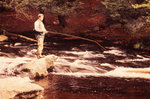 Description :L'HOMME SE TIENT DEBOUT SUR UN ROCHER ET TEND SA CANNE A PECHE. A L'ARRIERE-PLAN UN SOUS-BOIS.