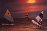 Description :TROIS VILIPLANCHISTES SE PROMENENT SUR UNE EAU CALME DEVANT UN MERVEILLEUX COUCHER DE SOLEIL.
