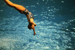 Description :UNE JEUNE FEMME EFFECTUE UN PLONGEON. TETE EN BAS, JAMBES EN L'AIR ELLE S'APPRETE A PENETRER DANS L'EAU.