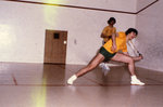 Description :DEUX JEUNES HOMMES S'ADONNENT A LEUR SPORT FAVORI DANS UNE SALLE APPROPRIEE. ILS SONT VETUS DE T-SHIRTS JAUNES ET DES SHORTS VERTS: AUX COULEURS DE L'UNIVERSITE DE SHERBROOKE ?