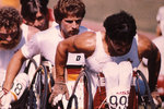 Description :QUELQUES ATHLETES EN FAUTEUIL ROULANT SE DISPUTENT UNE COURSE. A DROITE, ANDRE VIGER.