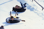 Description :UN ADULTE ET UN ENFANT GLISSENT SUR LES PENTES EN PNEUMATIQUE.