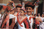 Description :VETUS D'HABITS FOLKLORIQUES UKRAINIENS, UN GROUPE DANSE. LES JEUNES FILLES PORTENT UNE COURONNE DE FLEURS SUR LA TETE, AVEC RUBANS MULTICOLORES, FOULARDS ET VESTES BRODEES. LES HOMMES, UN CHAPEAU NOIR AVEC TIGES DE FLEURS ET VESTES BRODEES DE ...
