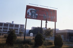 Description :EN AVANT-PLAN, UN PANNEAU PUBLICITAIRE DE LA CELANESE MACULE DE PEINTURE GRISE ET UN MANNEQUIN PENDU. DERRIERE LA CLOTURE GRILLAGEE, BATIMENTS DE LA CELANESE EN BRIQUES ROUGES.
