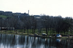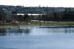 Description :EN AVANT-PLAN, LE LAC DES NATIONS. DERRIERE DES ARBRES BORDENT LE LAC. ESPACES VERTS. TENTE ET AUTOMOBILES. AU LOIN, LE CAMPUS UNIVERSITAIRE.