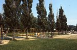 Description :DERRIERE DE GRANDS PEUPLIERS DES BALANCOIRES ONT ETE INSTALLEES. A DROITE, UNE GLISSOIRE. BEAUCOUP DE VERDURE. QUELQUES PERSONNES ET DES BICYCLETTES.