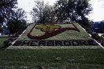Description :SUR UN PROMONTOIRE, ARRANGEMENT FLORAL REPRESENTANT LE LOGO DE SHERBROOKE AVEC LE NOM DE LA VILLE.