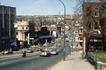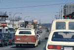 Description :RUE KING EN PERSPECTIVE D'OUEST EN EST. A GAUCHE NOMBREUX COMMERCES DONT L'ENSEIGNE DE "DELUXE AUTOMOBILES" A L'ARRIERE-PLAN. A DROITE, L'EDIFICE A BUREAU DU 1650 KING OUEST. A L'AVANT-PLAN, GROS PLAN SUR DES AUTOS.