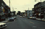 Description :VUE EN PERSPECTIVE DE LA RUE. COMMERCES DE PART ET D'AUTRE. VOITURES STATIONNEES ET QUELQUES UNES ROULANTES.