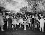 Description :GROUPES DE JEUNES POSANT POUR LA CAMERA DANS LEURS COSTUMES DE THEATRE 14.2 PEUT-ETRE LE JARDIN ENCHANTE.