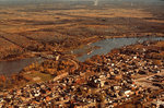 Description :VUE AERIENNE DE DRUMMONDVILLE TRAVERSEE PAR LA RIVIERE ST-FRANCOIS. A GAUCHE SECTEUR RURAL ET A DROITE DEVELOPPEMENT URBAIN.