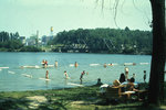 Description :PLUSIEURS BAIGNEURS S'AMUSENT DANS LA RIVIERE MAGOG. DES BOUEES BLANCHES DELIMITENT L'ESPACE RESERVE AUX BAIGNEURS. DEUX PERSONNES CONDUISENT UN CANOT EN DEHORS DE CES LIMITES. A DROITE UNE TABLE A PIQUE-NIQUE. A L'ARRIERE-PLAN LE PONT DU C.P....