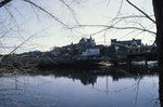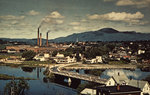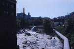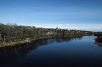 Description :LA RIVIERE MAGOG ET LE PONT MENANT A LA DOMINION TEXTILE A GAUCHE ET A L'ARRIERE-PLAN. DEVELOPPEMENT URBAIN A DROITE.