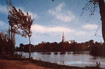 Description :LA RIVIERE BOURBON ENTOUREE D'ARBRES ET A L'ARRIERE-PLAN L'EGLISE ST-CALIXTE DE PLESSISVILLE.