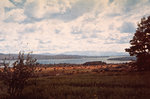 Description :12.1 LE LAC MEGANTIC A L'ARRIERE-PLAN. DEVANT QUELQUES ARBRES ET DE LA VERDURE. DES PETITS AMONCELLEMENTS DE FOIN. 12.2 LE LAC MEGANTIC A GAUCHE ET LA ROUTE A DROITE LONGEE D'ARBRES.