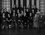 Description :DANS UNE SALLE DU CLUB SOCIAL, DISPOSES SUR TROIS RANGEES, 25 PERSONNES POUR UNE PHOTO DE GROUPE. EN PREMIERE RANGEE, DE GAUCHE A DROITE, UNE FEMME INCONNUE, L'EPOUSE DE M. MASSE, LE PROFESSEUR DUFOUR, JULES MASSE, PRESIDENT DE L'ECOLE DU BON ...