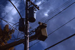 Description :PRISE EN CONTRE-PLONGEE D'UN TRAVAILLEUR DU SERVICE DE L'HYDRO-ELECTRICITE. IL EST INSTALLE DANS UNE NACELLE AU BOUT D'UN IMMENSE BRAS MECANIQUE. IL EFFECTUE UNE REPARATION FACE A UN POTEAU QUI RETIENT DEUX TRANSFORMATEURS.