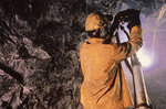 Description :LE TRAVAILLEUR PORTE UN MANTEAU ET UN CASQUE JAUNE ET TIENT UN MORCEAU DE MINERAI ENTRE SES MAIS. A SA GAUCHE, UN MUR QUI CONTIENT DE L'AMIANTE.